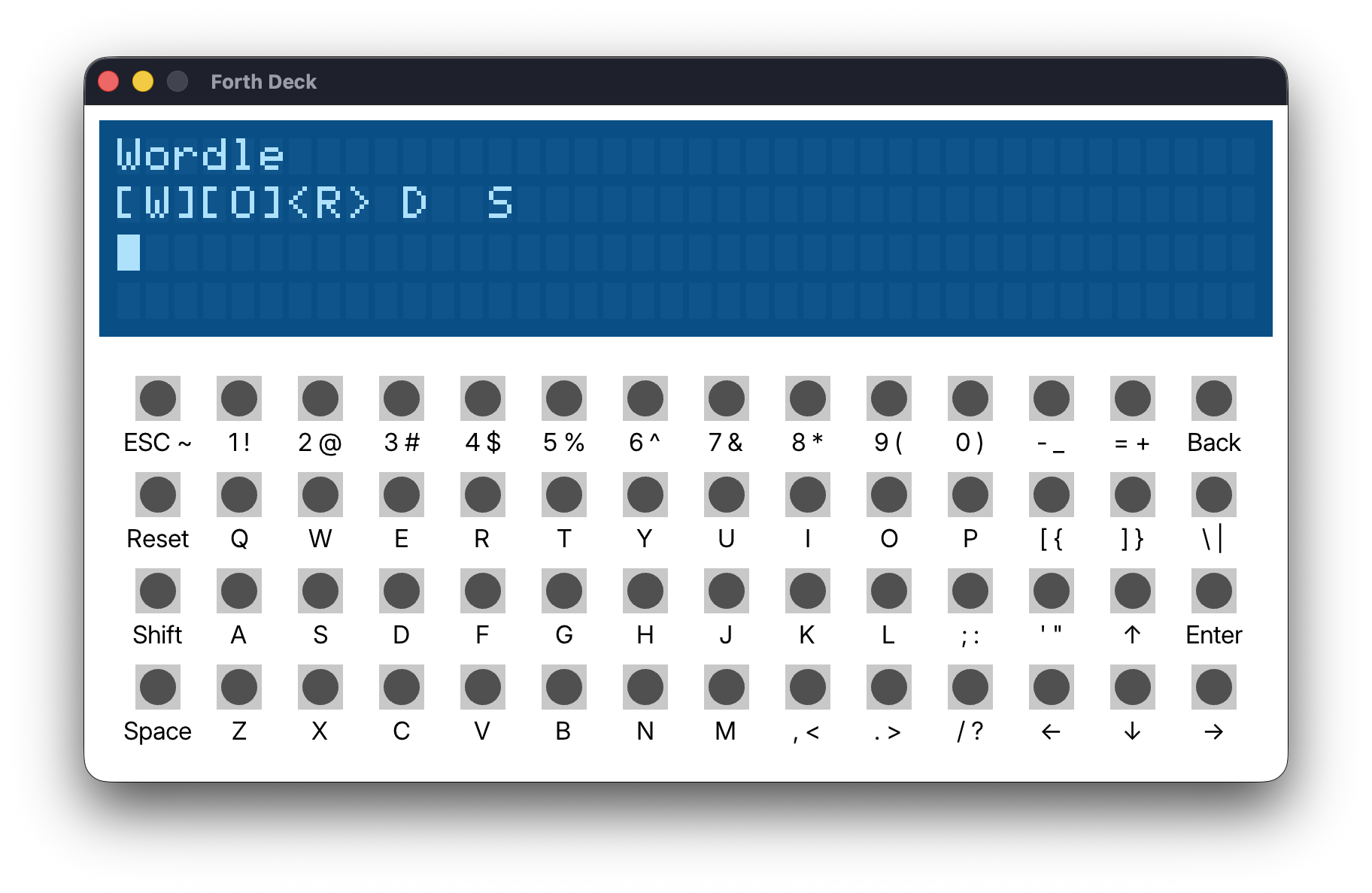 I’ve picked a simple game to write in Forth for the Forth Deck (although I’m not limiting myself to the Deck’s editor): Wordle! I’ve made a Wordle clone before, but this one presents a few interesting limitations. Due to the limited memory and very limited speed of My4TH, I’m simplifying things a bit by not requiring that guesses be real words.