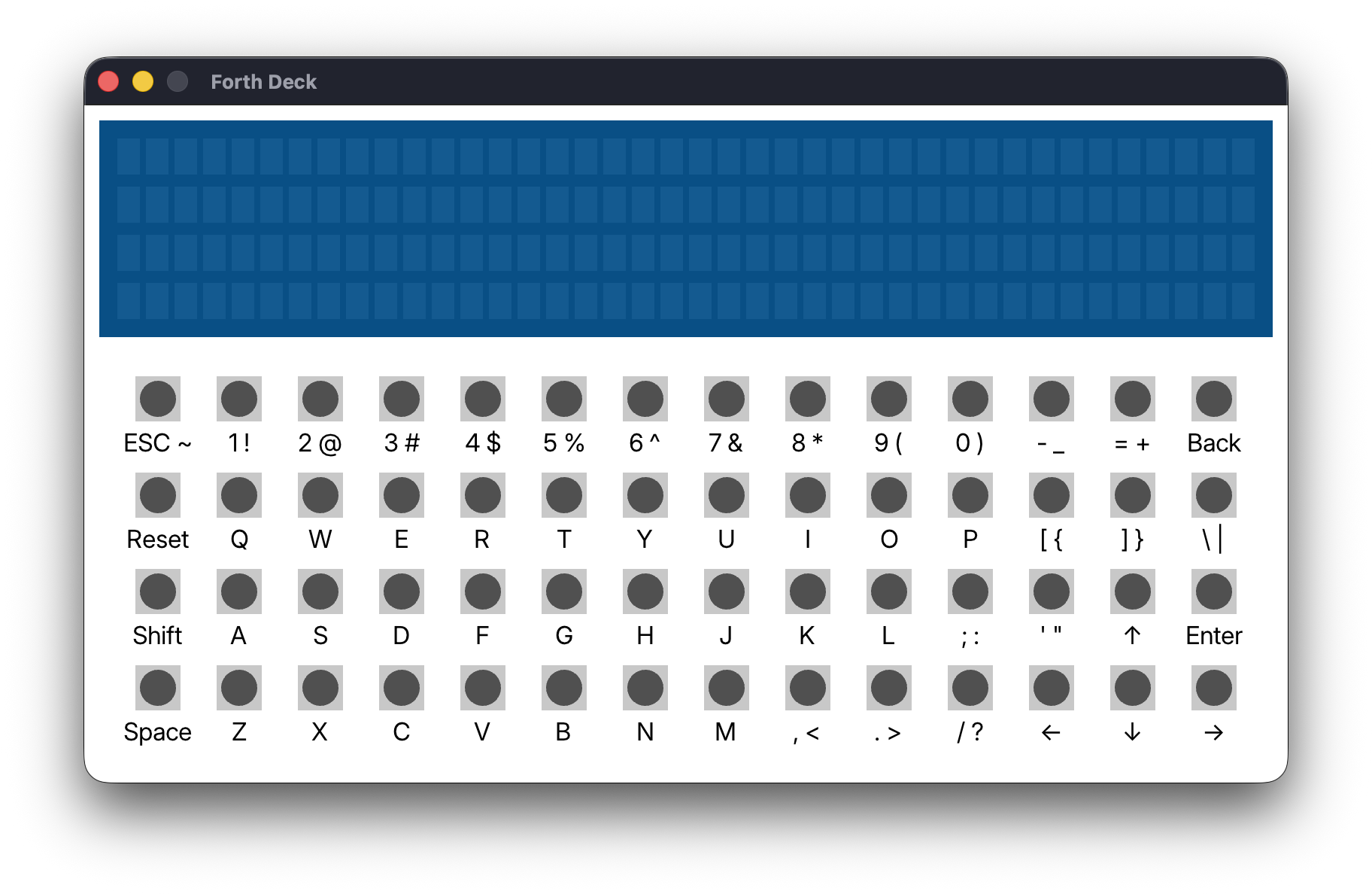 Behind the scenes, I have full CPU microcode emulation working, as well as UART via stdin/stdout, and a virtual I²C bus with EEPROM chips for persistence. When the Forth Deck UI is up though, I can’t see any of that. In theory it’s still running the My4TH ROM, but since I haven’t yet touched emulation of the display controller or the keyboard matrix, there’s no visible output.